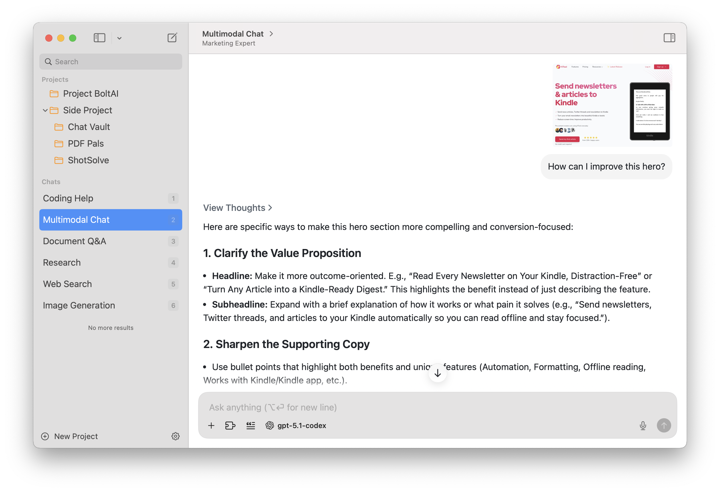 - Work with screenshots, PDFs, and documents. BoltAI extracts structure, summarizes, and explains.