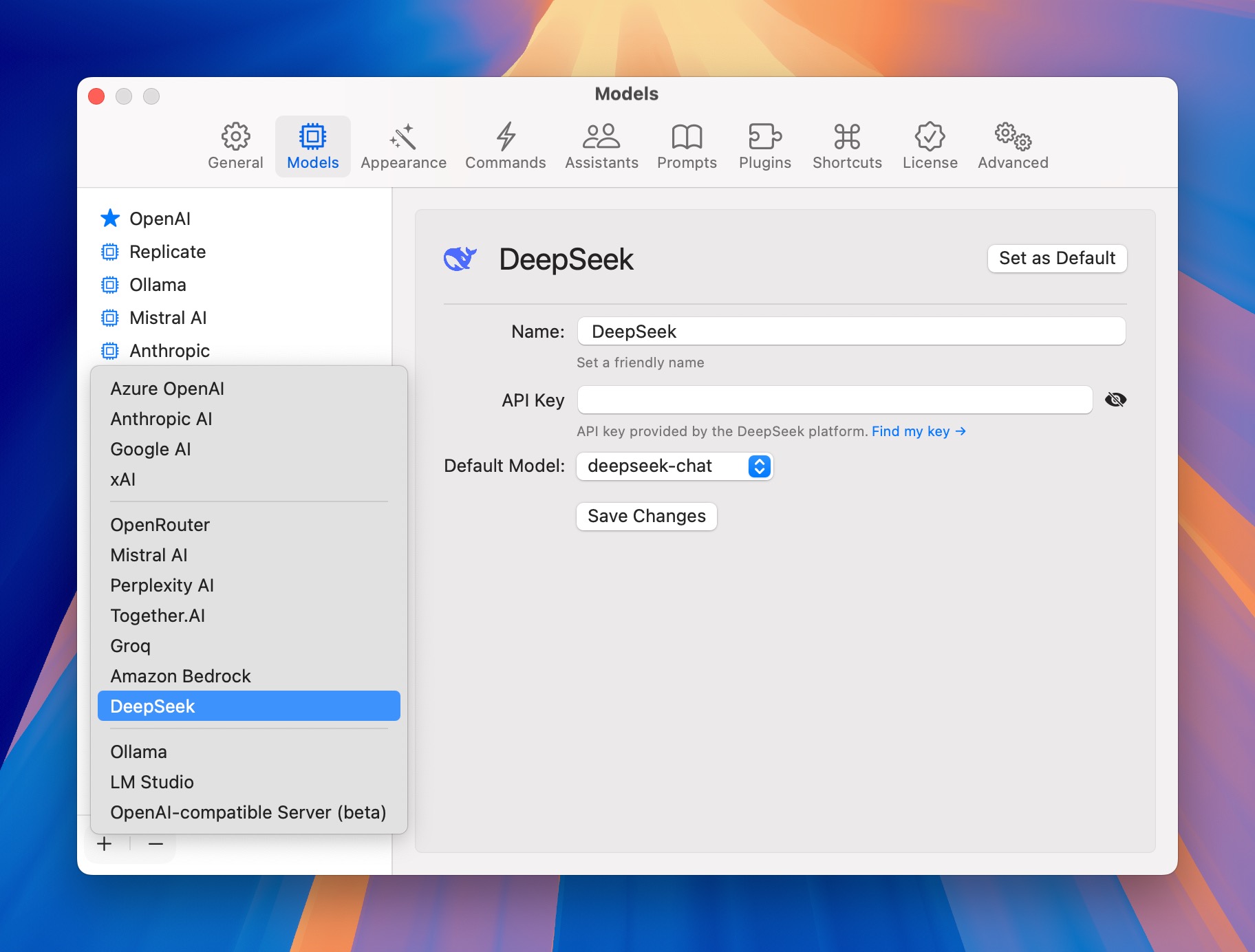 Go to Settings > Models, click the plus button and select DeepSeek.