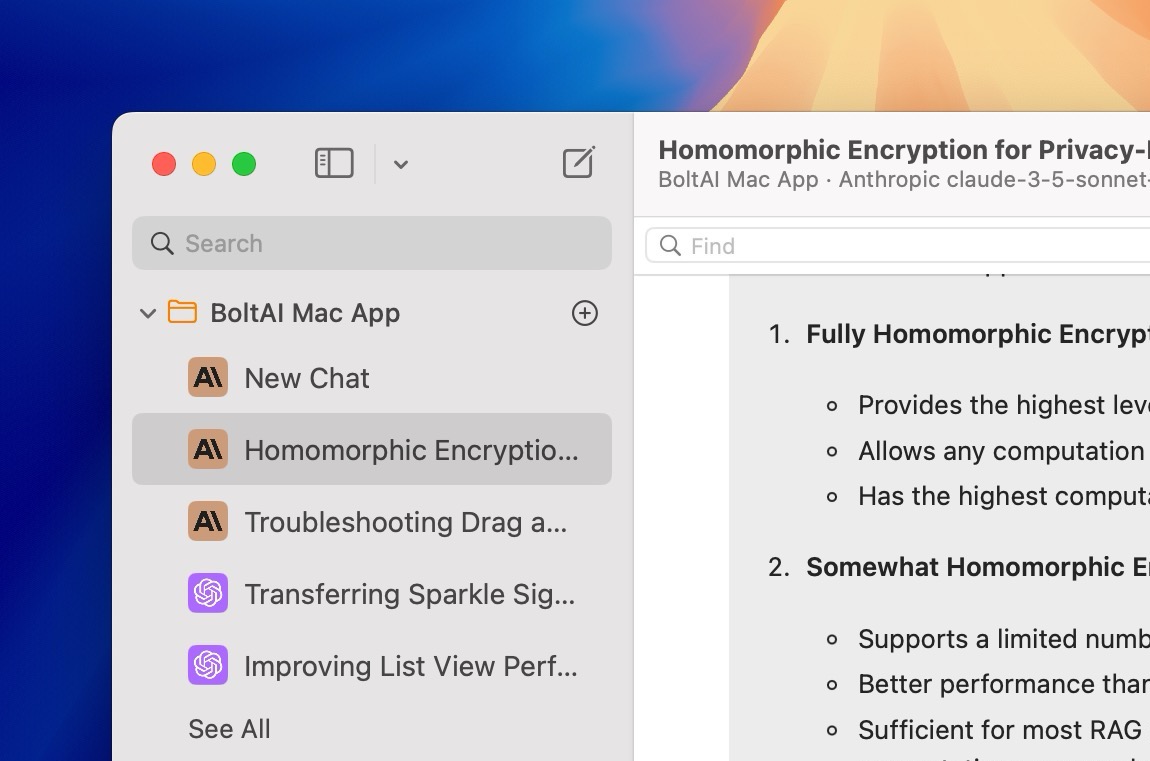 Many BoltAI's performance & stability issues come from the sidebar. In this release, I reimplemented the sidebar and it works a lot better (10x better). It's not an exaggeration. I tested with a few thousands chats and see no performance issues at all. Previously, BoltAI would struggle to render just a few hundreds chats.